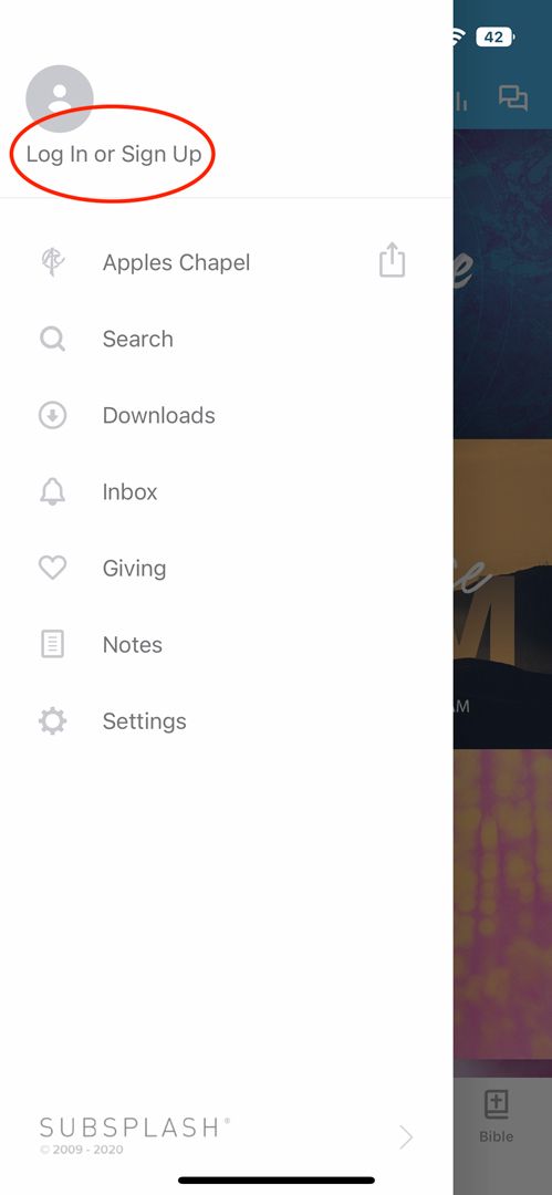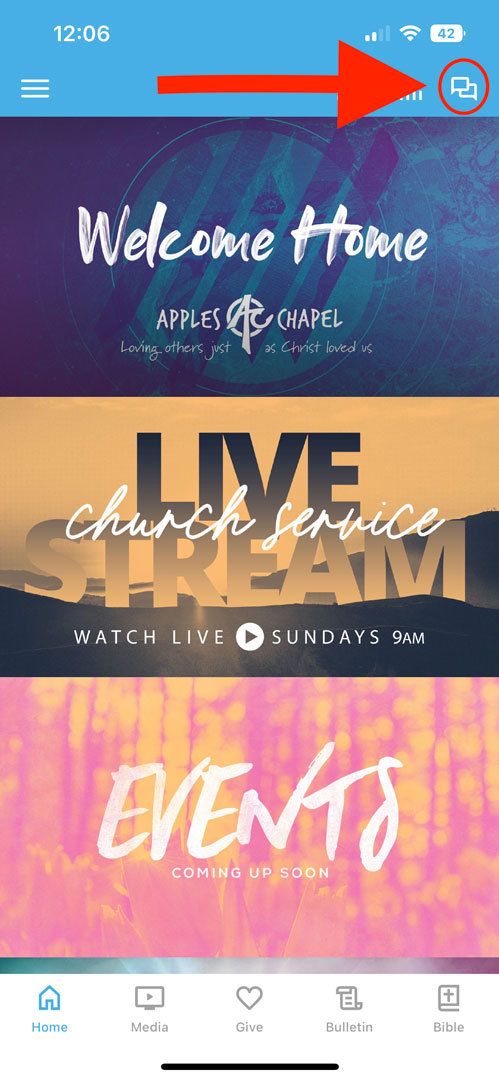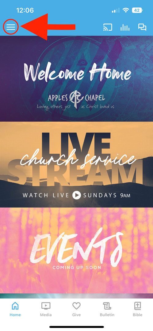 2) Within the Apples Chapel app, create an account or login if you already have an account. If you use online giving then you already have an account. The screenshots below show the steps to create an account or login.